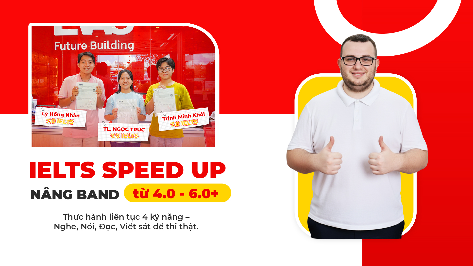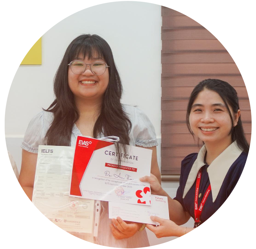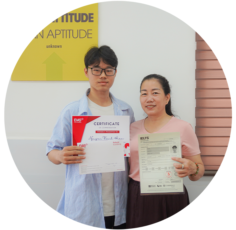 Tại EVAS đã giúp hàng trăm em đạt kết quả cao IELTS 6.0+. Lộ trình đào tạo từ căn bản đến nâng cao, giúp các em hoàn thiện kỹ năng tiếng Anh học thuật Nghe – Nói – Đọc – Viết, đạt được band điểm như kỳ vọng, chuẩn bị cho hành trình du học, nghiên cứu và học tập.